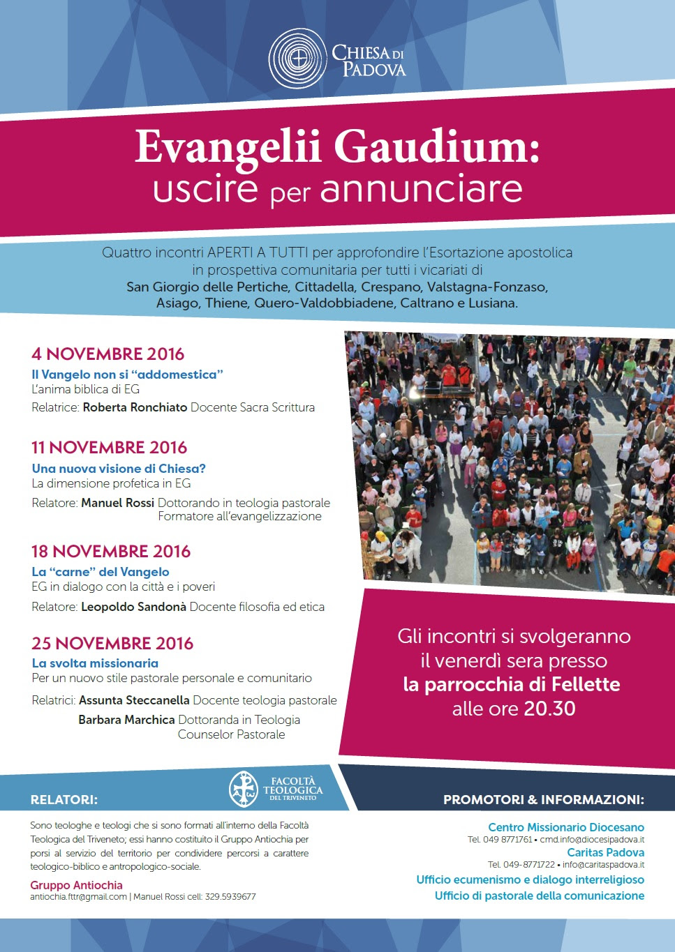 Il cuore del Pontificato di Francesco si trova nell’esortazione apostolica Evangelii Gaudium. Dopo gli incontri nella zona sud della Diocesi, a Carceri, con il “Gruppo Antiochia” composto da teologi, nel mese di novembre quattro venerdì sera da non perdere presso la parrocchia di Fellette, alle 20.30.