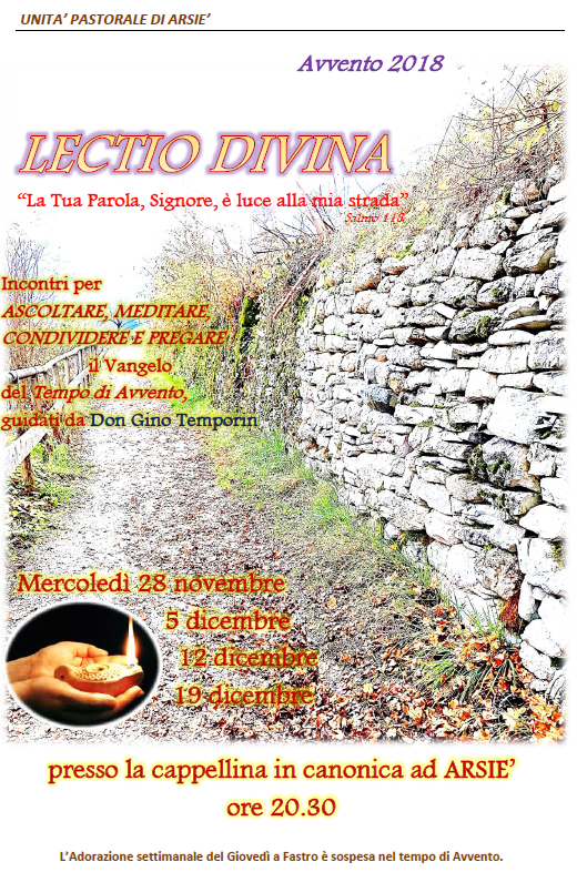 Avvento 2018: Lectio divina (quattro mercoledì ad Arsiè) Pubblicato giorno 24 novembre 2018 - In home page, news Qui la locandina: 2018AvventoLectioDivina