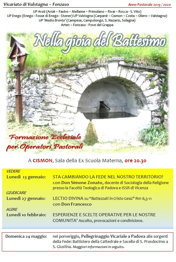tre incontri di formazione per operatori pastorali a Cismon, sala della ex-Scuola materna, alle ore 20.30.
